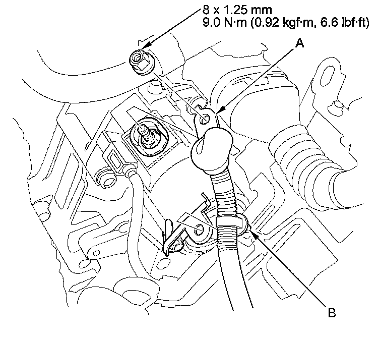 33. Connect the IMA motor power cable connector (A) and the harness clamp (B).