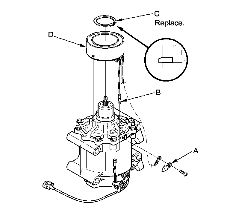 4. Remove the bolt and holder (A), then disconnect the field coil connector (B). Remove the snap ring (C) with snap ring pliers, then remove the field coil (D). Be careful not to damage the field coil and A/C compressor.