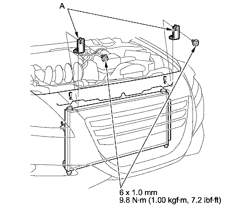 8. Remove the bolts and the A/C condenser brackets (A).