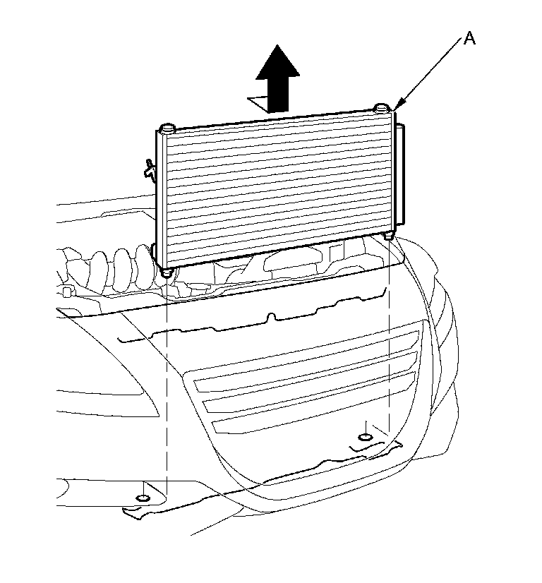 9. Remove the A/C condenser (A) by lifting it up. Be careful not to damage the radiator or A/C condenser fins when removing the A/C condenser.