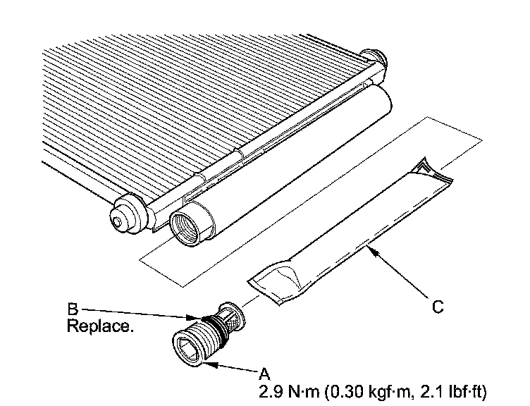 2. Remove the cap (A) from the bottom of the A/C condenser. Remove the O-ring (B) and the desiccant (C).