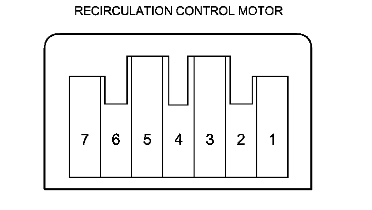 2. Connect battery power to recirculation control motor terminal No. 7, and ground terminals No. 1 and No. 3; the recirculation control motor should run smoothly. To avoid damaging the recirculation control motor, do not reverse power and ground. Disconnect terminal No. 1 or No. 3 from ground; the recirculation control motor should stop at Fresh (when terminal No. 3 is disconnected) or Recirculate (when terminal No. 1 is disconnected). Don't cycle the recirculation control motor for a long time.