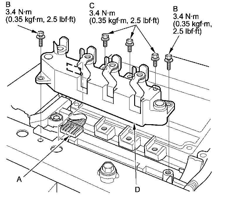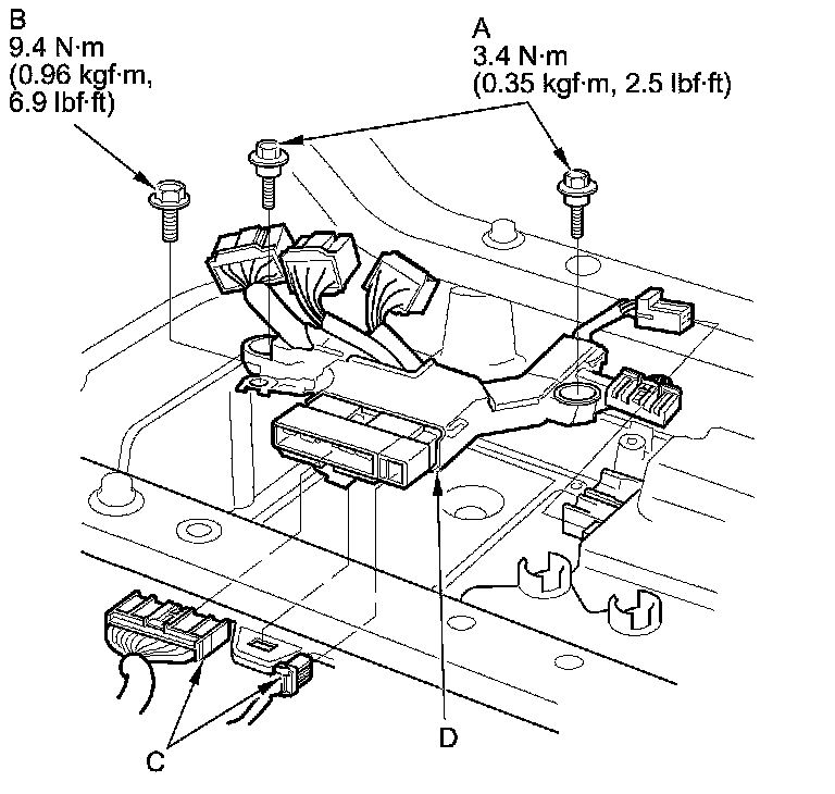 5. Disconnect the connectors (C), then remove the PCU wire harness (D).