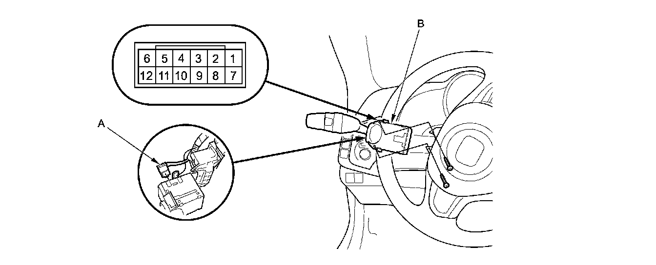 2. Disconnect the 12P connector (A) from the combination light switch (B).