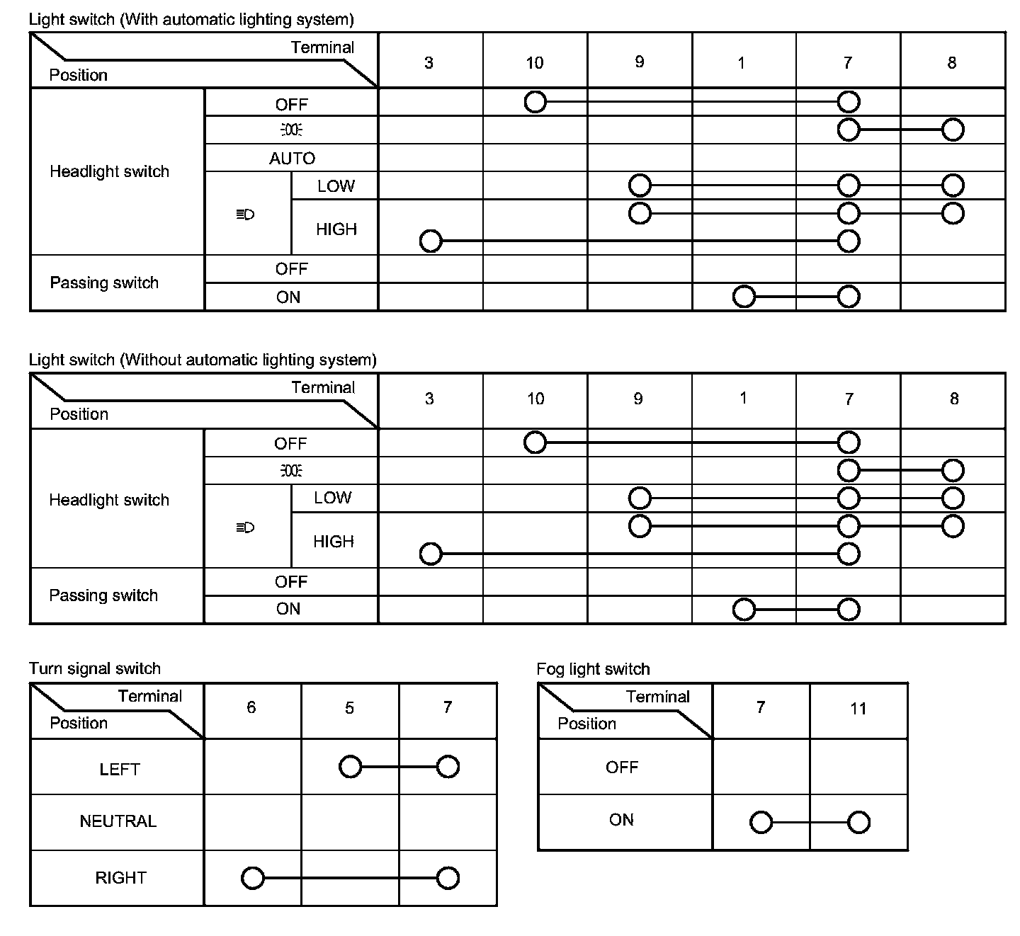 - If the terminals look OK, check for continuity between the terminals in each switch position according to the tables.