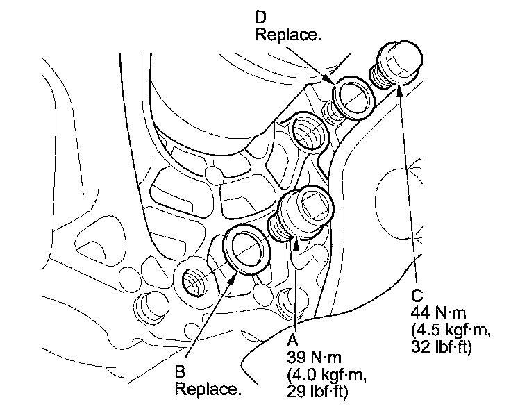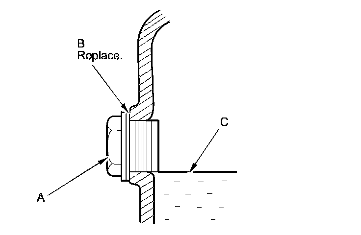 3. Remove the filler plug (A) and the sealing washer (B), check the condition of the MTF, and make sure it is at the proper level (C).