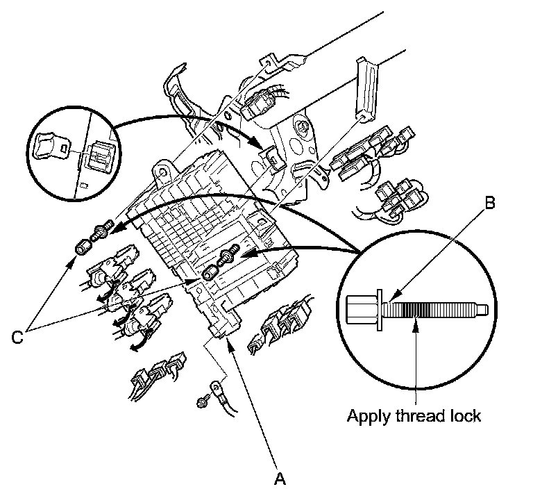9. Install the relays and connect the connectors to the under-dash fuse/relay box (A), then install the under-dash fuse/relay box in the reverse order of removal.