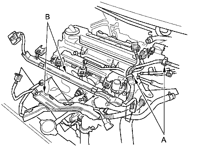 5. Remove the heater hose bracket (A) and the ground cable bolt (B).