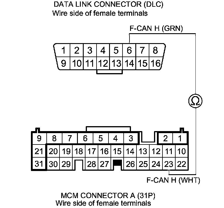22. Check for continuity between MCM connector terminal A23 and DLC terminal No. 6.