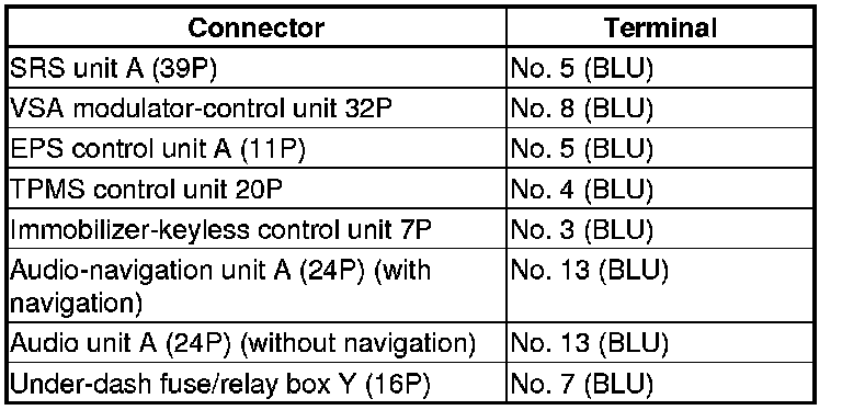 Repair a short in the wire between the DLC (K-line) and the VSA modulator-control unit, the SRS unit, the EPS control unit, the TPMS control unit, the immobilizer-keyless control unit, the audio-navigation unit (with navigation), the audio unit (without navigation), or the under-dash fuse/relay box.�
