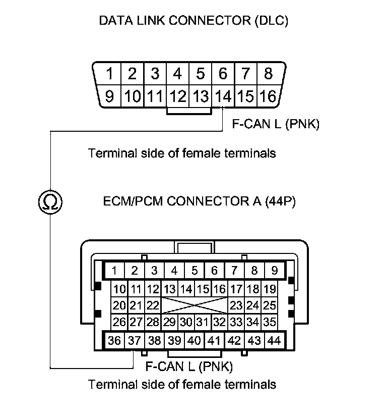 34. Check for continuity between ECM/PCM connector terminal A37 and DLC terminal No. 14.
