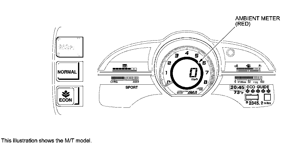 In Sport mode, the ambient meter color is red at all times, and the shift indicator lamp (SIL) stays off (M/T).