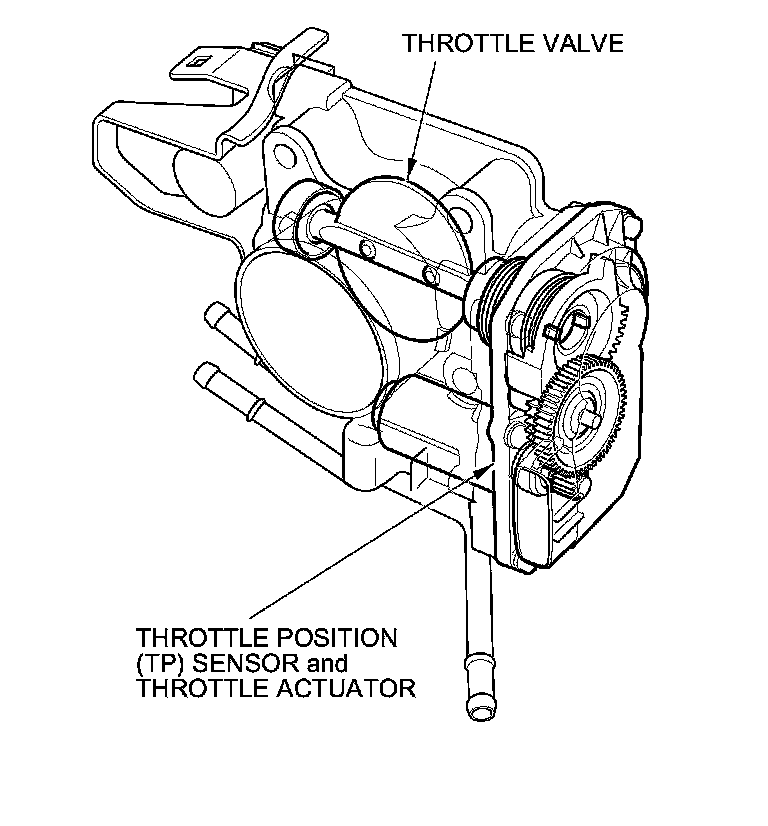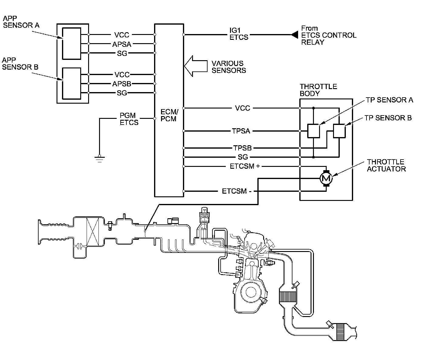 The electronic throttle control system consists of the throttle actuator, TP sensor A/B, the APP sensor A/B, the ETCS control relay, and the ECM/PCM.