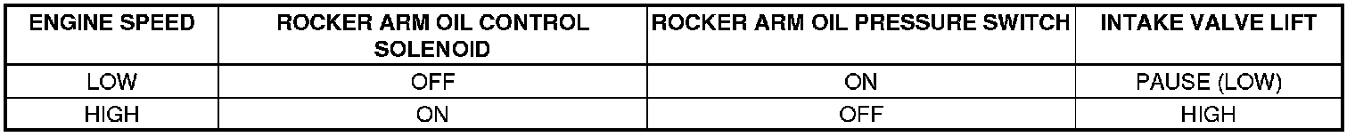 At low engine speed, the rocker arm oil control solenoid is turned off by the ECM/PCM. Oil pressure from the rocker arm oil control valve does not enter the intake rocker shaft. Each intake rocker arm is separated by a return spring and the intake secondary rocker arm is lifted by the low lift cam lobe.