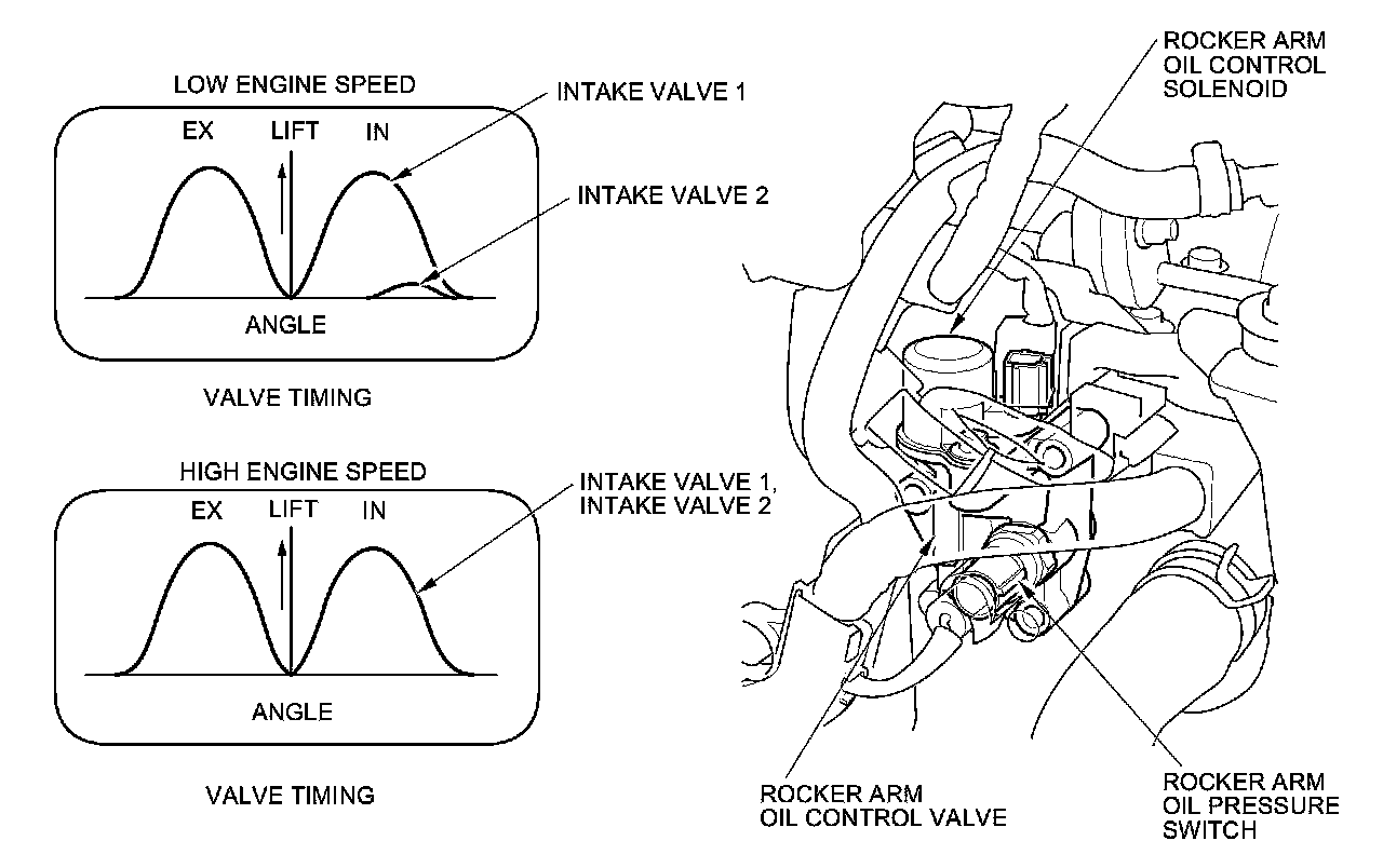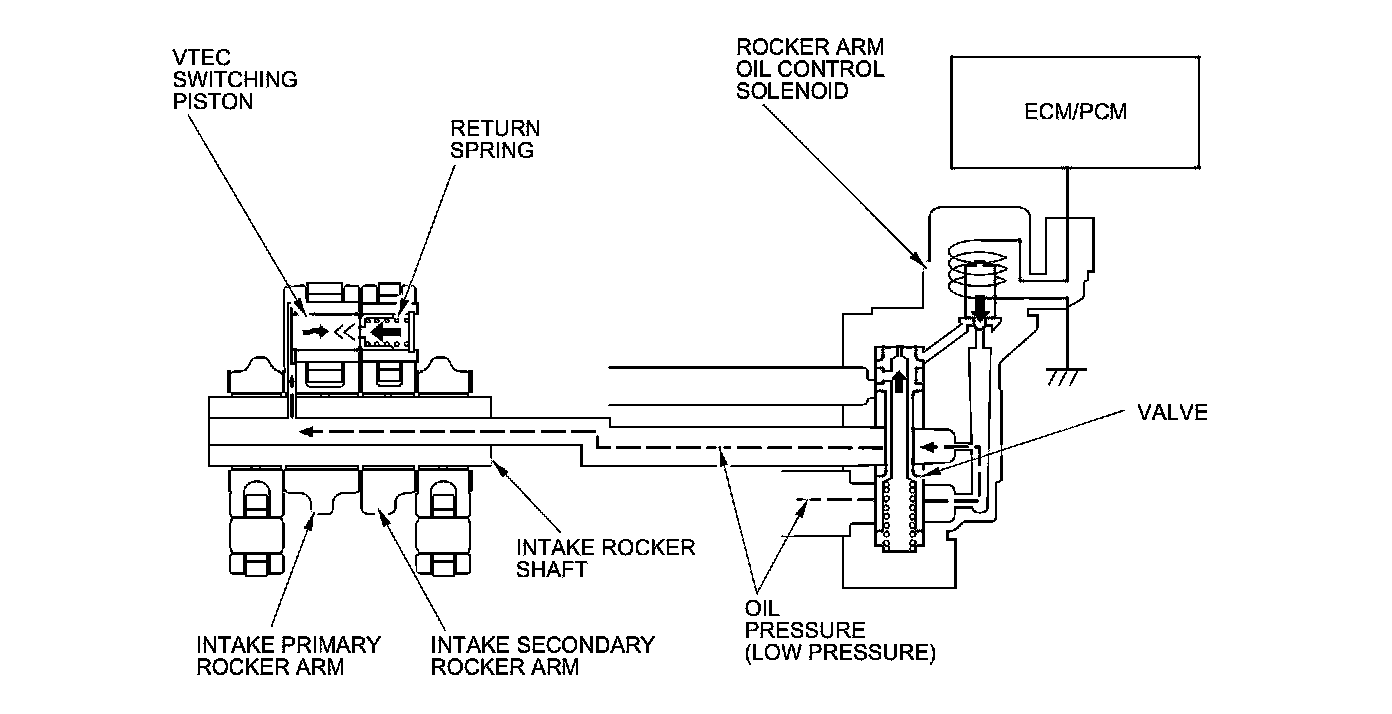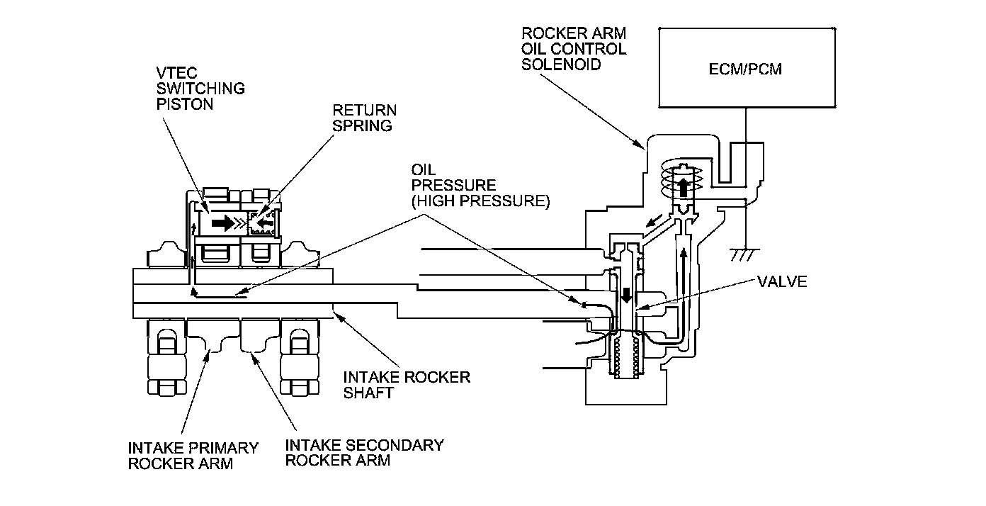 At high engine speed, the rocker arm oil control solenoid is turned on by the ECM/PCM. Oil pressure from the rocker arm control solenoid enters into the intake primary rocker arm via the rocker shaft, and it moves the VTEC switching piston in the rocker arm. This causes the VTEC switching piston to slide into the intake secondary rocker arm, locking the rocker arms together. Both intake rocker arms are lifted by the high lift cam lobe.