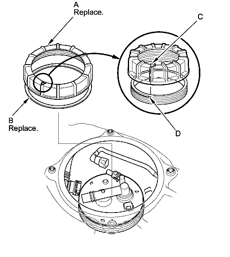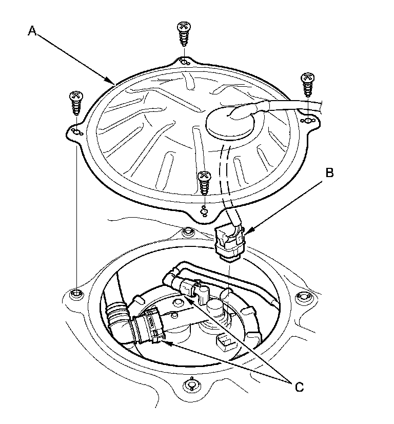 5. Disconnect the quick-connect fittings (C) from the fuel tank unit Fuel Line/Quick-Connect Fitting Removal.