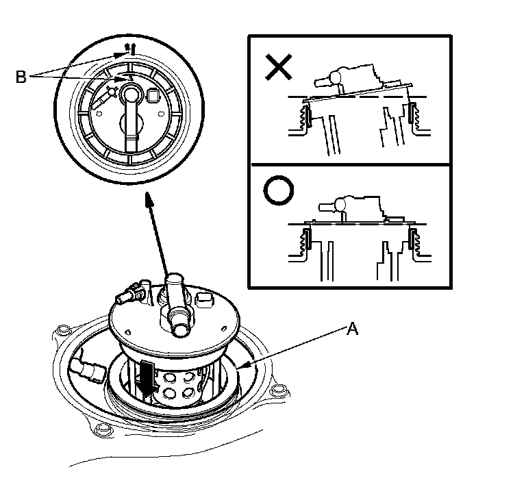 3. Align the marks (B) on the fuel tank and fuel tank unit, then insert the fuel tank unit into the fuel tank until the fuel tank unit rests on top of the base gasket.
