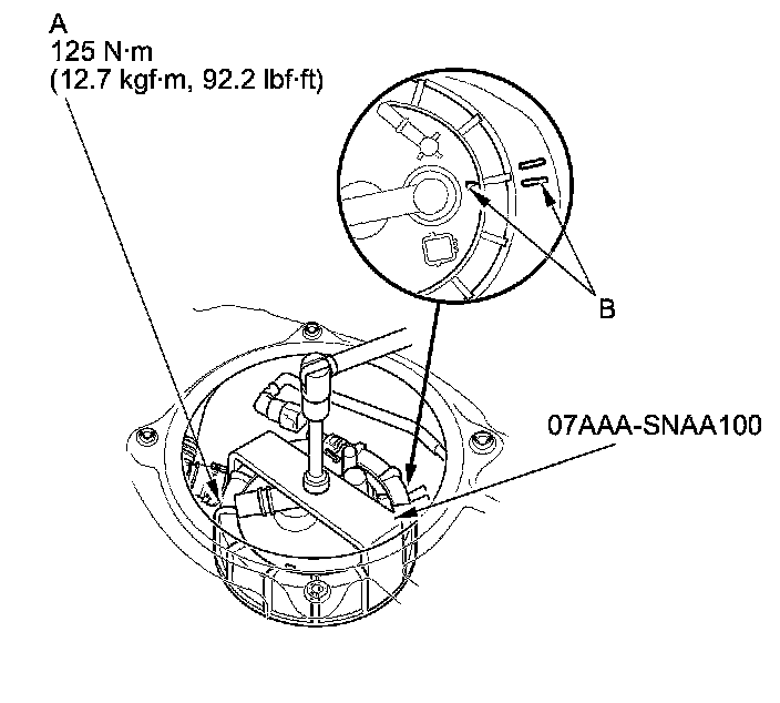4. Using the special tool, tighten a new locknut (A) with a new locknut plate (B) to the specified torque.