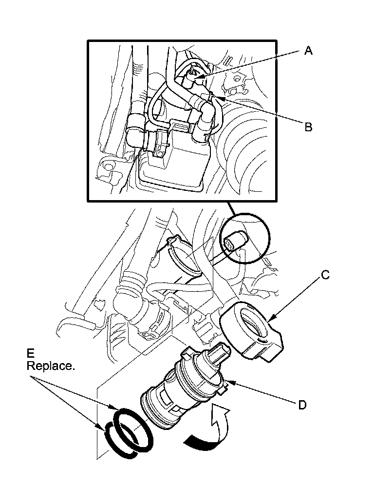 6. Install the parts in the reverse order of removal with new O-rings (E) and a new cap.