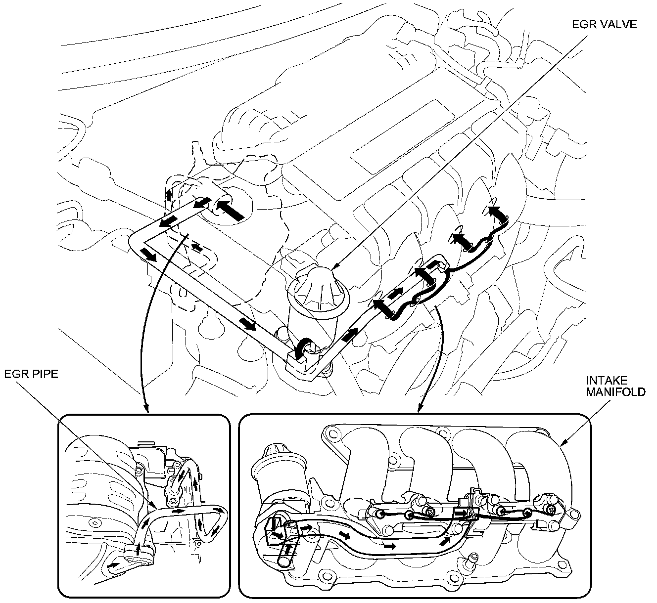 The EGR system reduces oxides of nitrogen (NOx) emissions by recirculating exhaust gas through the EGR pipe and the intake manifold, and into the combustion chambers. Routing the exhaust gas through the EGR pipe helps to prevent carbon deposits from forming in the intake manifold and the throttle body. The ECM/PCM memory contains the ideal EGR valve positions for various operating conditions.