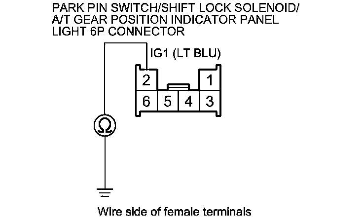 15. Check for continuity between park pin switch/shift lock solenoid/A/T gear position indicator panel light 6P connector terminal No. 2 and body ground.