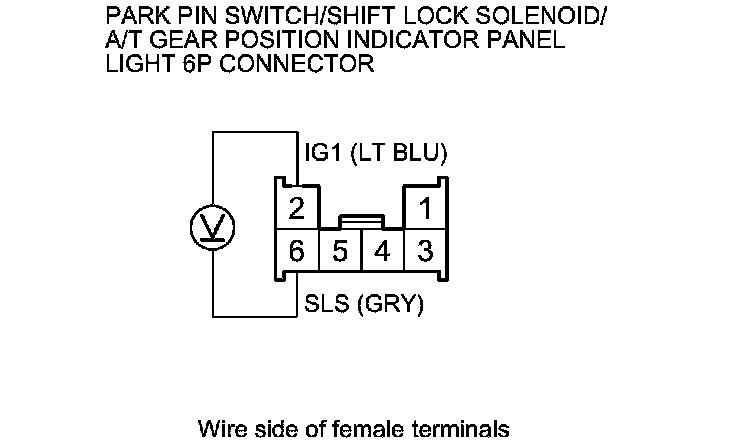18. Release the brake pedal, and measure the voltage between park pin switch/shift lock solenoid/A/T gear position indicator panel light 6P connector terminals No. 2 and No. 6. The shift lever must be in P.