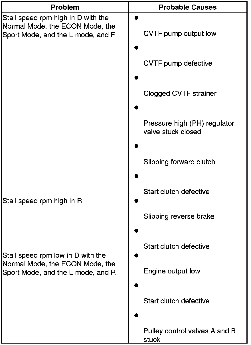 13. If the stall speeds are out of the service limit, the problems and probable causes are listed in the table.