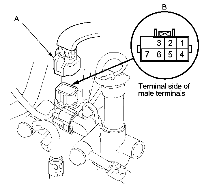3. Measure the inhibitor solenoid resistance between solenoid wire harness 7P connector (B) terminal No. 7 and body ground.