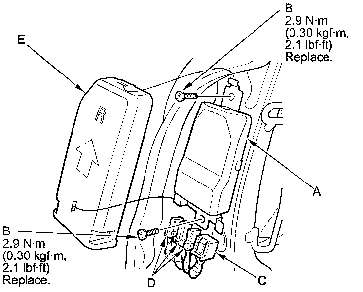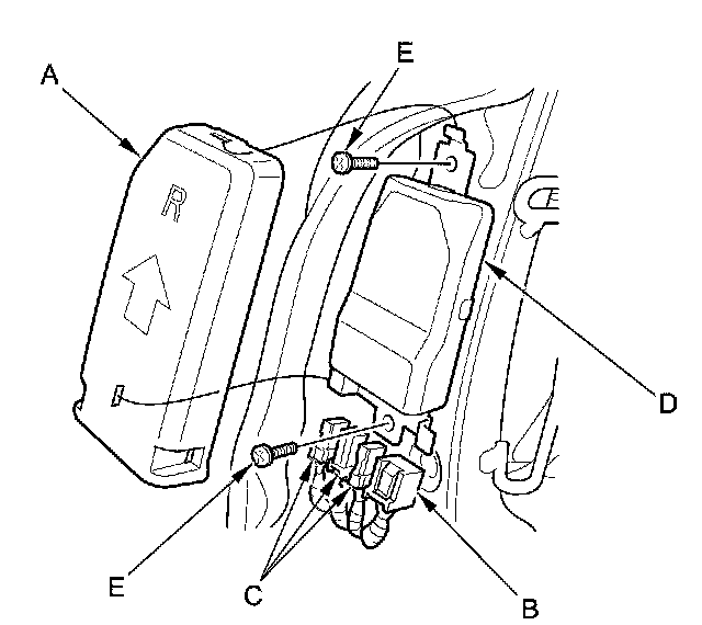 2. Connect the ODS unit harness 18P connector (C) and the OPDS sensor connectors (D) to the ODS unit. Reinstall the cover (E).