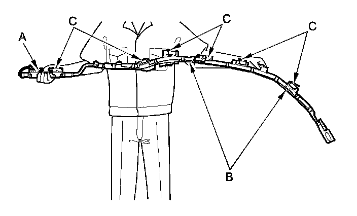 - The side curtain airbag module assembly is a long, jointed part containing an inflator (A), a flexible bag (B), and brackets (C). When removing or installing the side curtain airbag assembly, never: