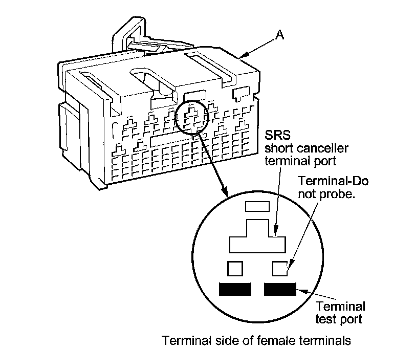 When diagnosing or troubleshooting at an SRS unit connector (A), use the terminal test port below the terminal you need to check. Gently insert the pin probes of the tester or jumper wire at the terminal test port from the terminal side.