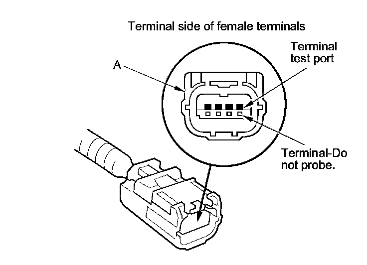 When diagnosis/troubleshooting is done at water proof connector (A), use the terminal test port above the terminal you need to check. Gently contact the pin probe of the tester or jumper wire at the terminal test port from the terminal side.