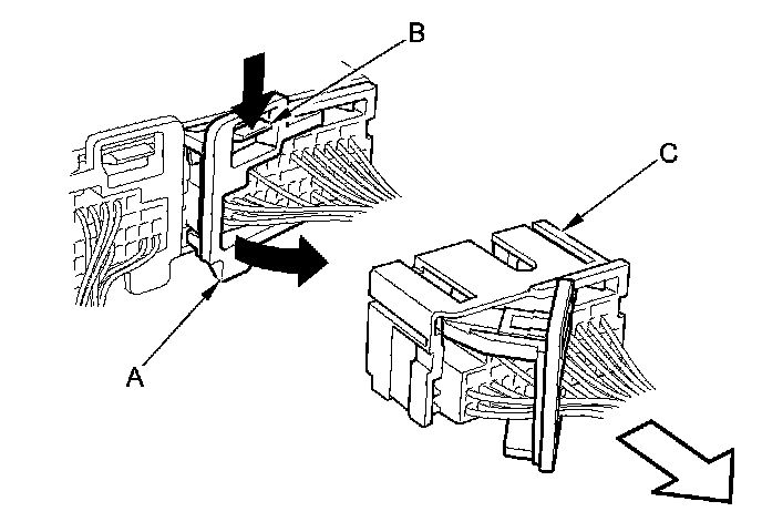 To release the lock, pull the lever (A) while pushing the lock (B) on the outside of the connector, then pull out the connector (C).