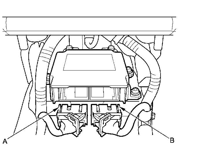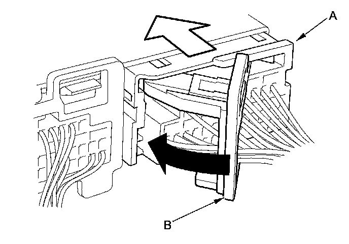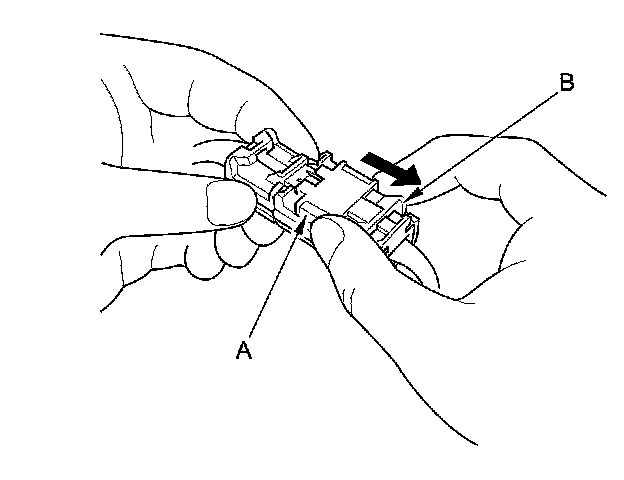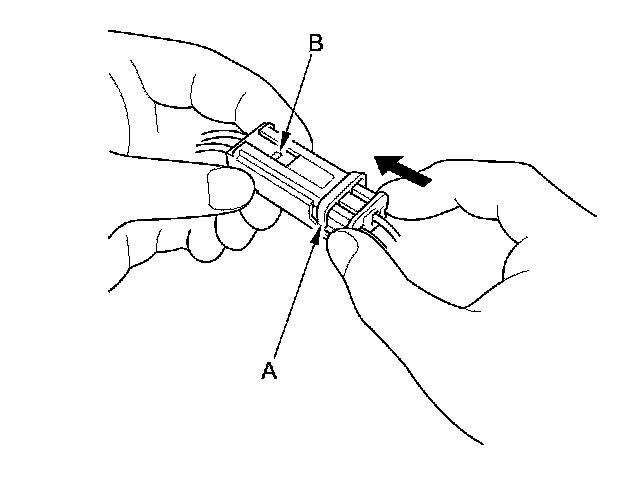 To reconnect the connector, push in on the connector (A). As the connector is pressed in, the lever (B) moves to the locked position.