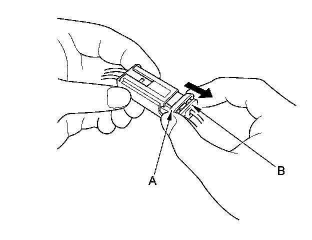 To reconnect, hold the pawl-side connector, and press on the back of the sleeve-side connector in the direction shown. As the two connector halves are pressed together, the sleeve (A) is pushed back by the pawl (B). Do not touch the sleeve.