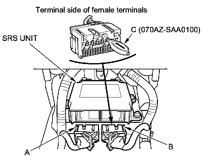 When SRS unit connector A (39P) or B (39P) is disconnected, a short circuit is automatically created in the connector to prevent accidental deployment of an airbag or tensioner. The circuit may need to be opened sometimes when diagnosing the system. Insert an SRS short canceller (C) in the specified cavities when necessary to keep the circuit open for diagnosis.