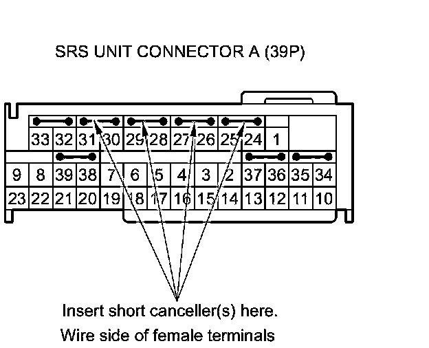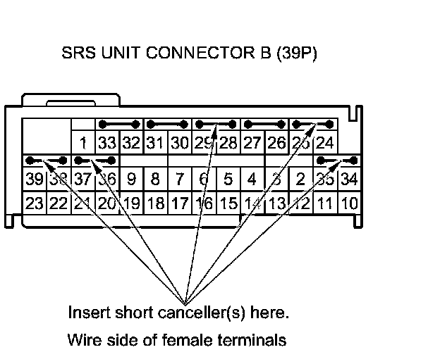 Terminal numbers are shown from the wire side of the female terminals. Insert the SRS short canceller(s) into the cavities on the terminal side of the connector.