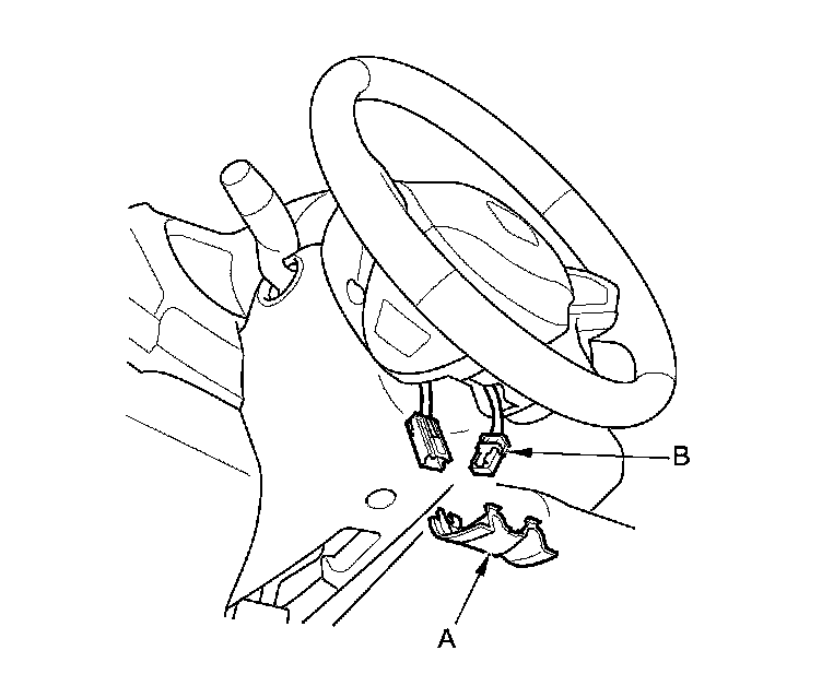 2. Remove the access panel (A) from the steering wheel, then disconnect the driver's airbag inflator 4P connector (B) on the cable reel harness.