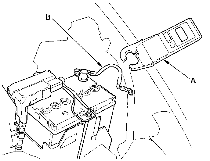 10. Attach the LH41 AC/DC low current clamp meter (A) to the battery ground cable (B) follow the equipment manufacturer's instructions, then measure the parasitic draw.