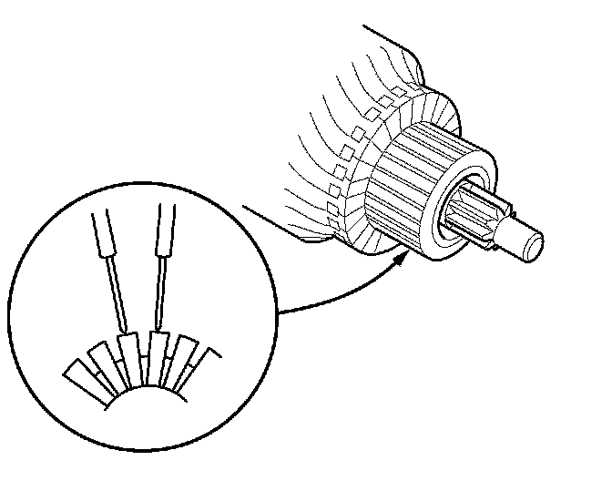 9. Use an ohmmeter to check for continuity between the segments of the commutator. If there is an open circuit between any segments, replace the armature.