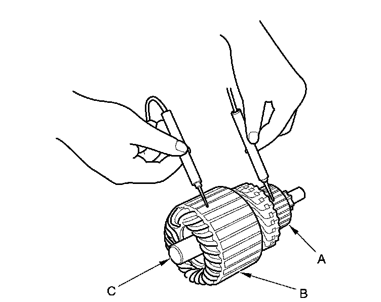11. Use an ohmmeter to check for continuity between the commutator (A) and the armature coil core (B), and between the commutator and the armature shaft (C). If there is continuity, replace the armature.