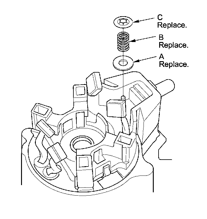 18. When the brush holder is replaced: Replace the brush holder set with the moving contact (A), the contact spring (B), and the push nut (C).