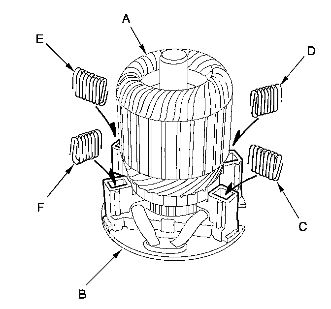 21. While squeezing a brush spring (C), insert it in the hole on the brush holder, and push it until it bottoms. Repeat this for the other three springs (D, E, and F).