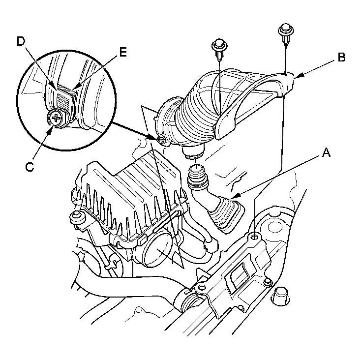 11. Remove the intake air tube (A) and the resonator chamber joint (B).
