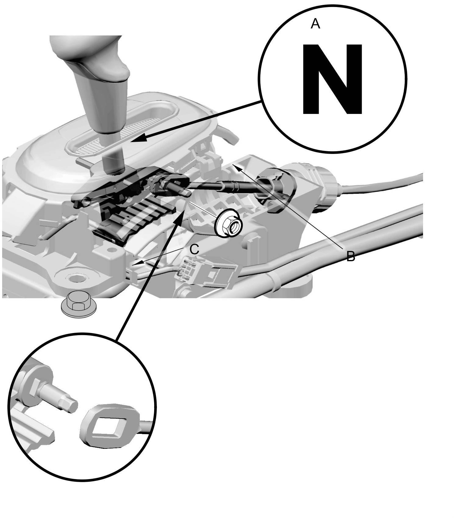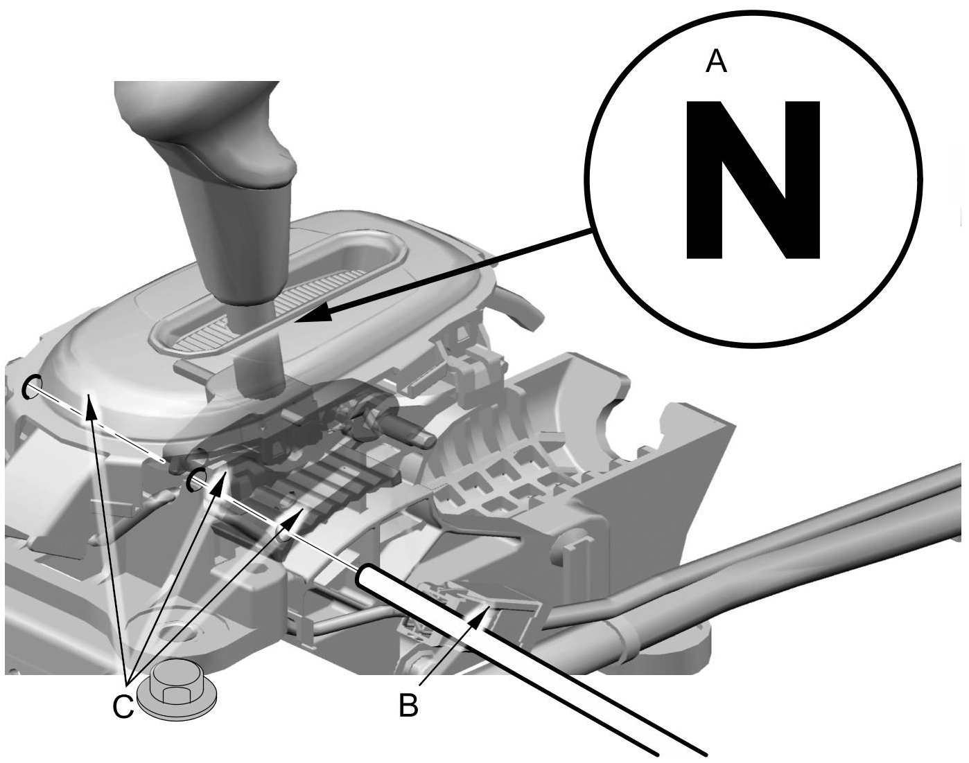 29. Place the shift lever in N (A), then insert a 6 mm (0.24 in) pin (B) into the positioning holes (C) on the shift lever bracket base and into the positioning hole on the shift lever. Use only the 6 mm (0.24 in) pin that is free of burrs.