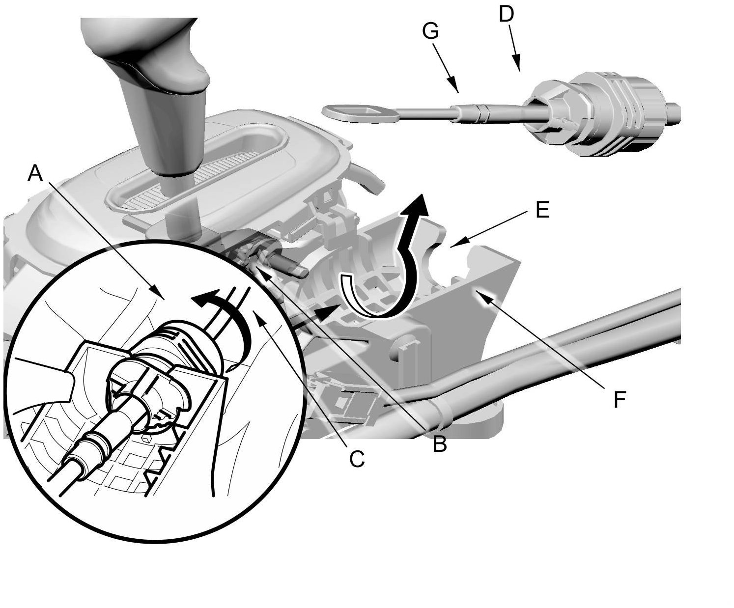 5. Rotate the socket holder (A) on the shift cable (B) counterclockwise (C) a quarter turn; the corner (D) on the socket holder will be in the opening (E) of the shift lever bracket base (F). Then slide the socket holder to remove the shift cable from the shift lever bracket base. Do not remove the shift cable by pulling the shift cable guide (G).