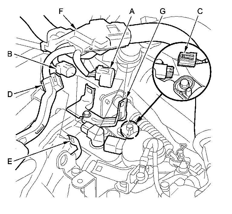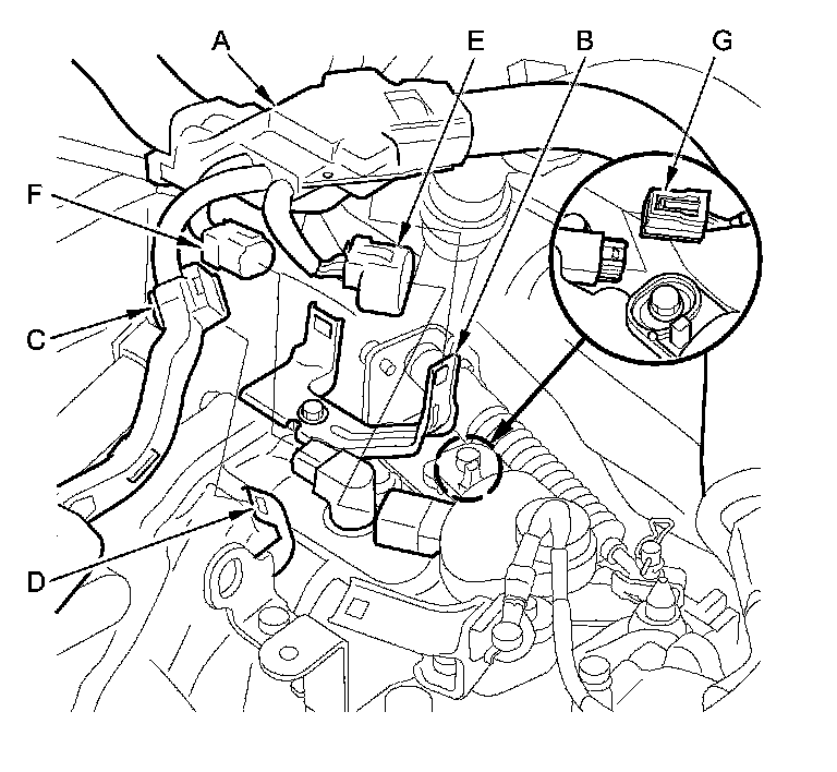 23. Connect the transmission range switch 8P connector (E), the CVT output shaft (driven pulley) speed sensor 3P connector (F), and the vehicle speed sensor 3P connector (G).