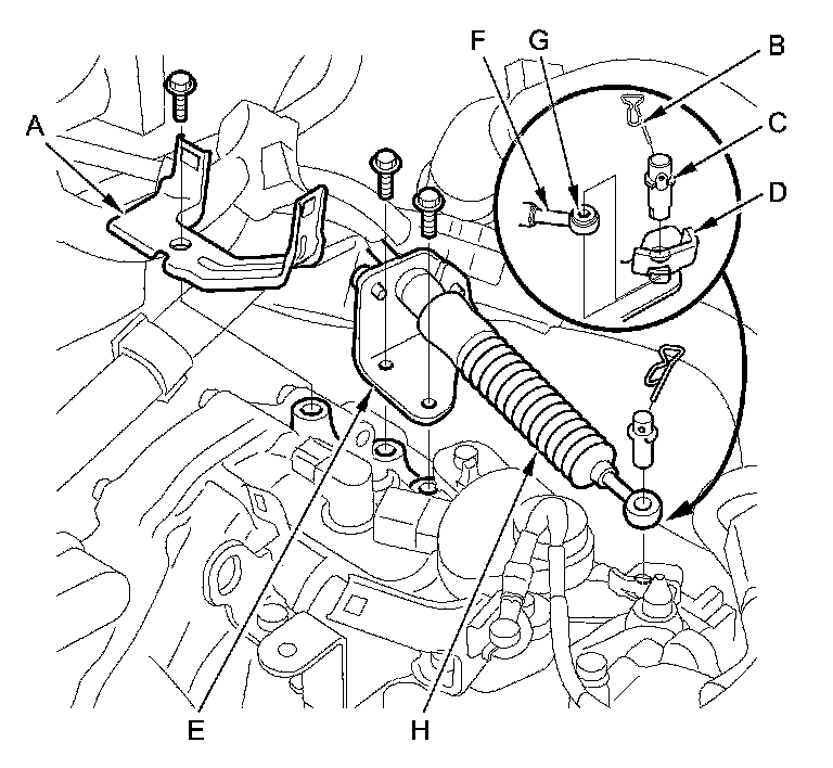 12. Remove the bolts securing the shift cable holder (E), then separate the shift cable end (F) from the selector control lever. Check the shift cable end collar (G) for wear or damage, and replace the shift cable (H) Service and Repair if necessary.