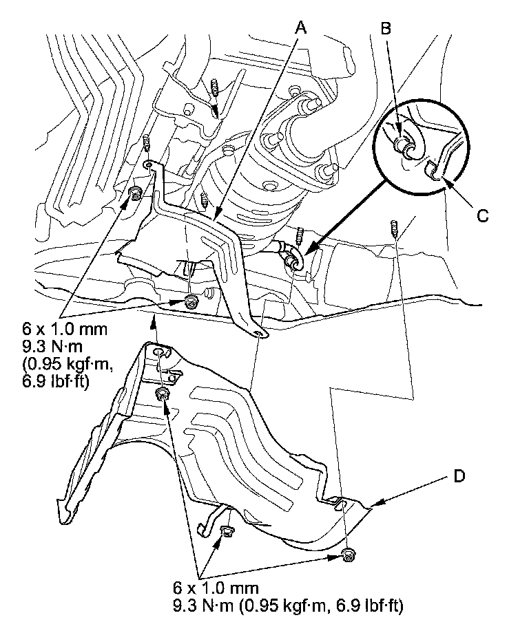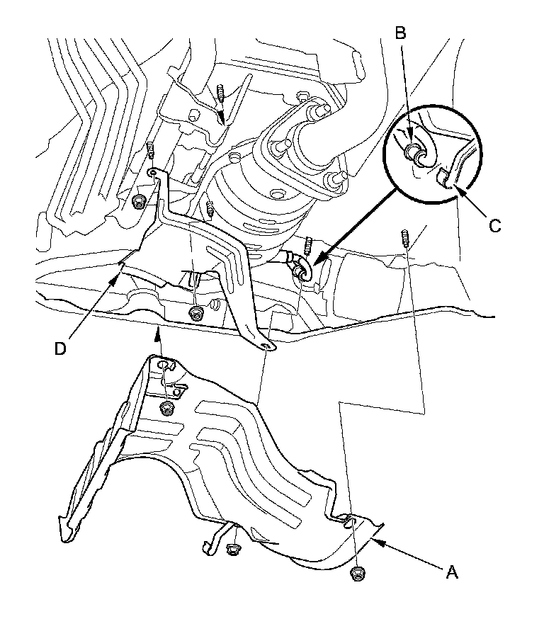 13. Remove the heat shield (A), and the secondary HO2S harness clamp (B) from the clamp bracket (C) of the heat shield, then remove the heat shield (D).