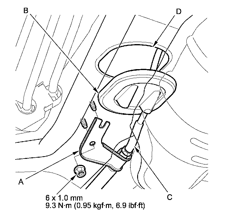 16. Insert a new shift cable through the grommet hole (D), and install the grommet in its hole. Do not bend the shift cable excessively. Then secure the shift cable bracket with the nut.